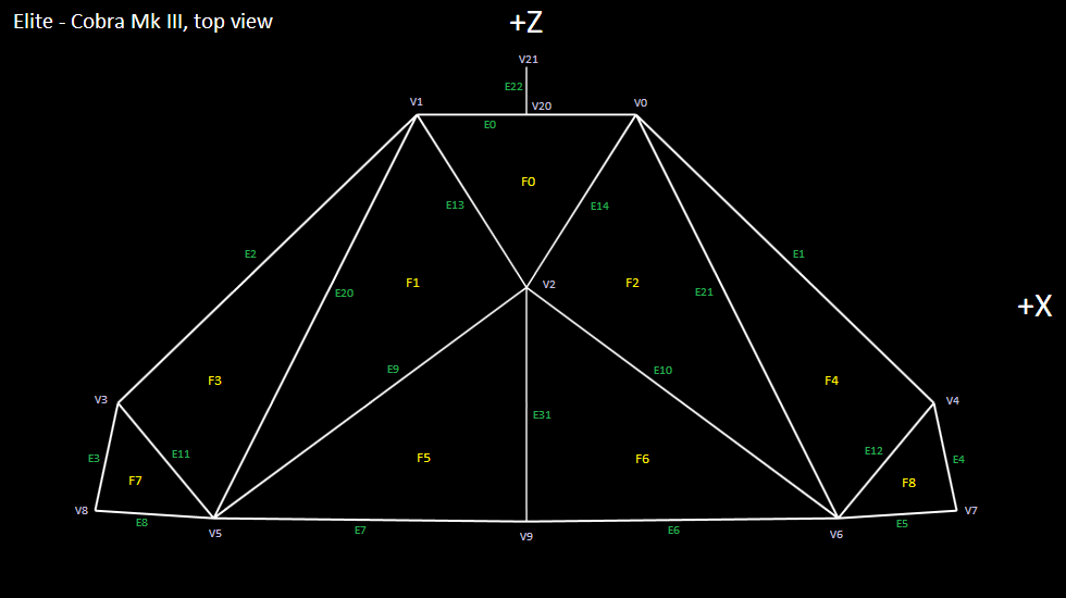 How do we fix this? By rewriting the surface normals. This is a little awkward because Elite doesn't store faces as a list of vertices. We can figure out which edges and vertices are associated with each face by looking through the vertex and edge lists, but there's a problem. The laser turret on the front of the ship is edge 22, drawn when either face 0 or 11 is visible. However, the edge isn't actually part of either face, and would throw off our calculations if we tried to use it.