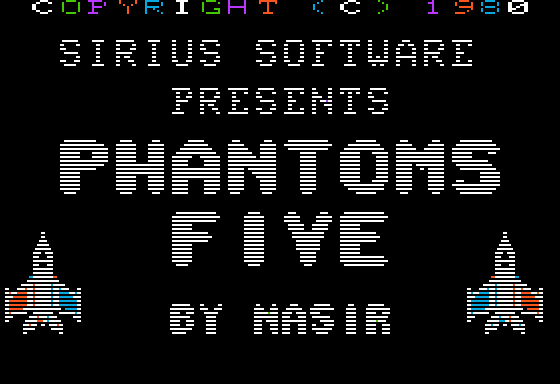 Phantoms Five is a vertically-scrolling game for the Apple II in which the player bombs targets on the ground. Occasionally it switches to a first-person view of incoming fighter planes that must be shot down. According to Nasir Gebelli's wikipedia page, it was the third game he wrote and published through Sirius Software.
